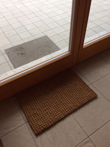 (外に置いてある古いマット、猫が掘って穴が空きそうになっているので、