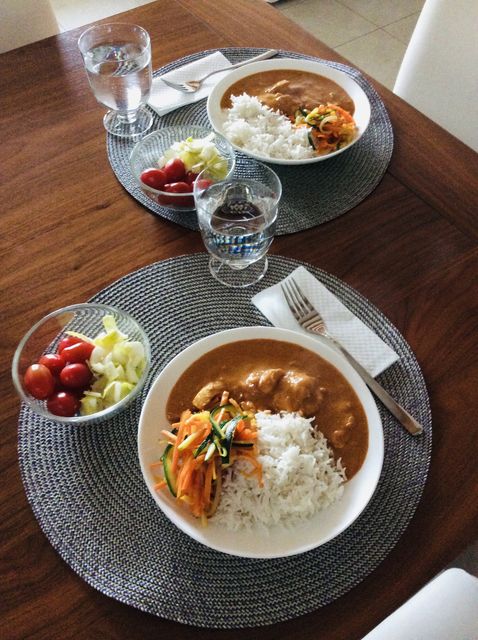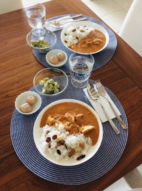 久々にバターチキンを作りました。やっぱり美味しいですね〜。バスマティの上には少しナッツを載せています。(インドレストランの真似。)
