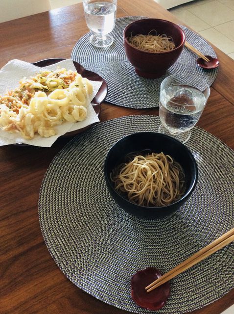 (昼)お蕎麦、天ぷら(人参・玉ねぎ・ズッキーニのかき揚げ、イカの天ぷら)