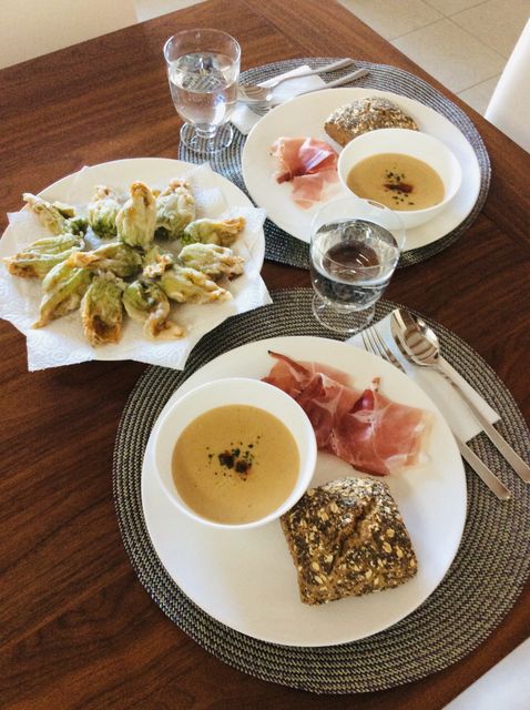 (昼)ズッキーニの花のフライ、海老のビスク、スペック、パン