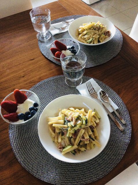 (夜)ズッキーニとスペックのクリームパスタ、ヨーグルト(蜂蜜、いちご、ブルーベリー)