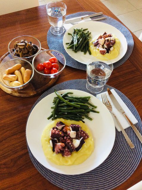 『ガリシア風タコ』が好きなので、それをちょっと変化させて、下に敷くジャガイモをマッシュポテトにしました。