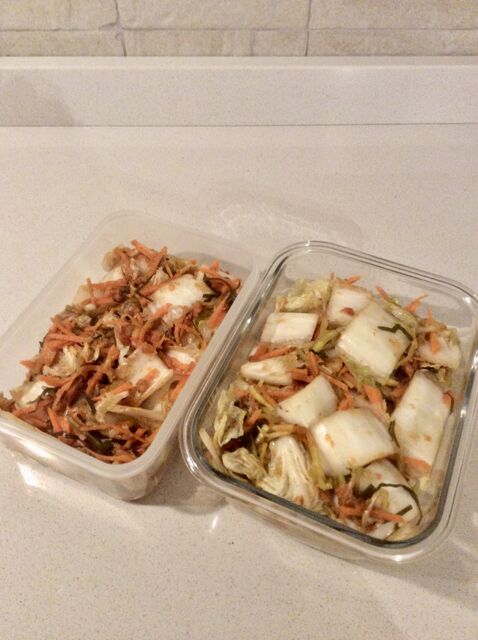 4、5日後くらいからが食べ頃のようですが、できた直後でももうすでにすごく美味しい。お店で売っているキムチと遜色ありません。ちょうど今日3日目で、また食べてみたところ、若干塩気が弱い気がしたので、日持ち的にどうかなという心配はありますが、味はかなり美味しいです。もうこれは白菜さえ手に入ればいつでも作れます!(私が行く何軒かのスーパーでは、冬でも白菜は時々見かける程度で、いつもあるわけではないので・・・。でもキャベツでも作れるのかな?)