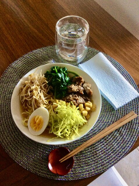 スープをナンプラー、チャーシュー用の豚肉を茹でた茹で汁、醤油で作ったところ、「京風ラーメン」のようなあっさりした美味しいスープができました。京風ラーメン、今もあるのか分かりませんが、京風ラーメンのお店、私が中学、高校の頃とても流行っていて、友達と街に出かけるとよく行っていました。京風ラーメンとパフェを売りにしているお店で、いつもラーメンを食べた後、パフェを注文していましたね。パフェも底がコーンフレークで底上げしてあるようなタイプで今は売れなさそうですが、当時は「コーンフレークがちょっと嫌だなぁ」とは思いながらも好きで、毎回注文していました。懐かしい・・・。